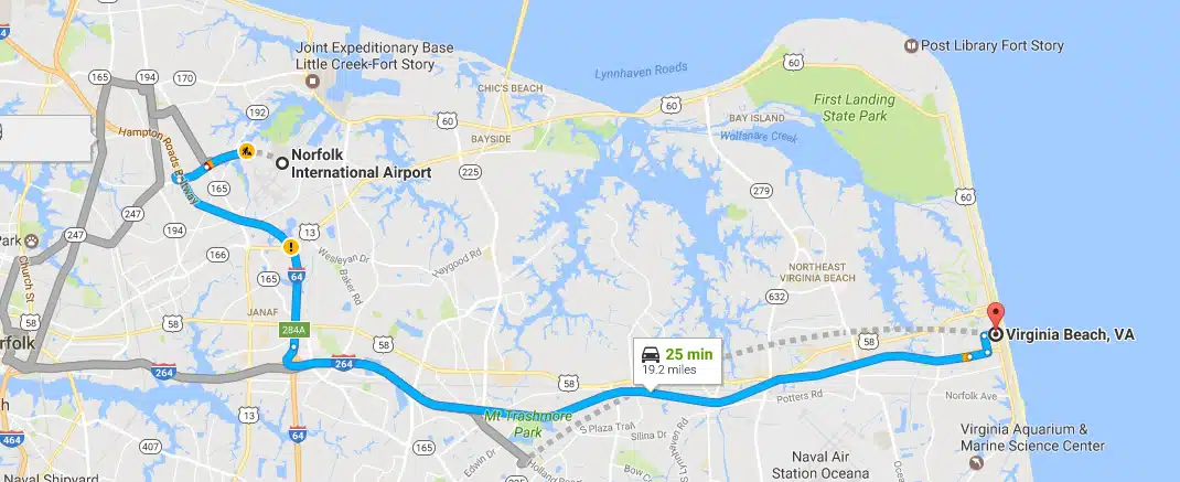 It is approximately 19 miles from the Norfolk International Airport (ORF) to the Virginia Beach oceanfront and it takes approximately 25 minutes to travel that distance.