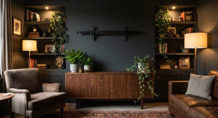 A dark-walled living room pairs naturally with a forged replica, while a more layered space might suit intricate hilt detailing.