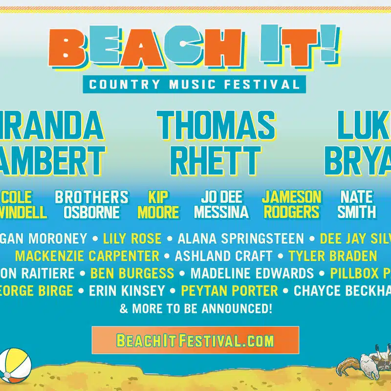 BEACH IT! Festival is a brand new country music festival coming to Virginia Beach June 23-25, 2023 featuring headliners Miranda Lambert, Thomas Rhett, Luke Bryan and 20+ more of country’s biggest stars.