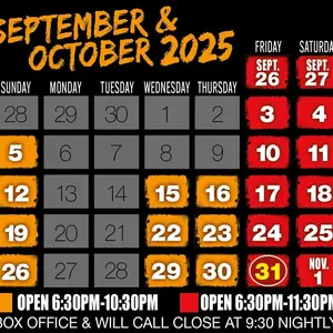 Open 9/26, 9/27, 10/3, 10/4, 10/5, 10/10, 10/11, 10/12, 10/15, 10/16, 10/17, 10/18, 10/19, 10/22, 10/23, 10/24, 10/25, 10/26, 10/29, 10/30, 10/31, 11/1